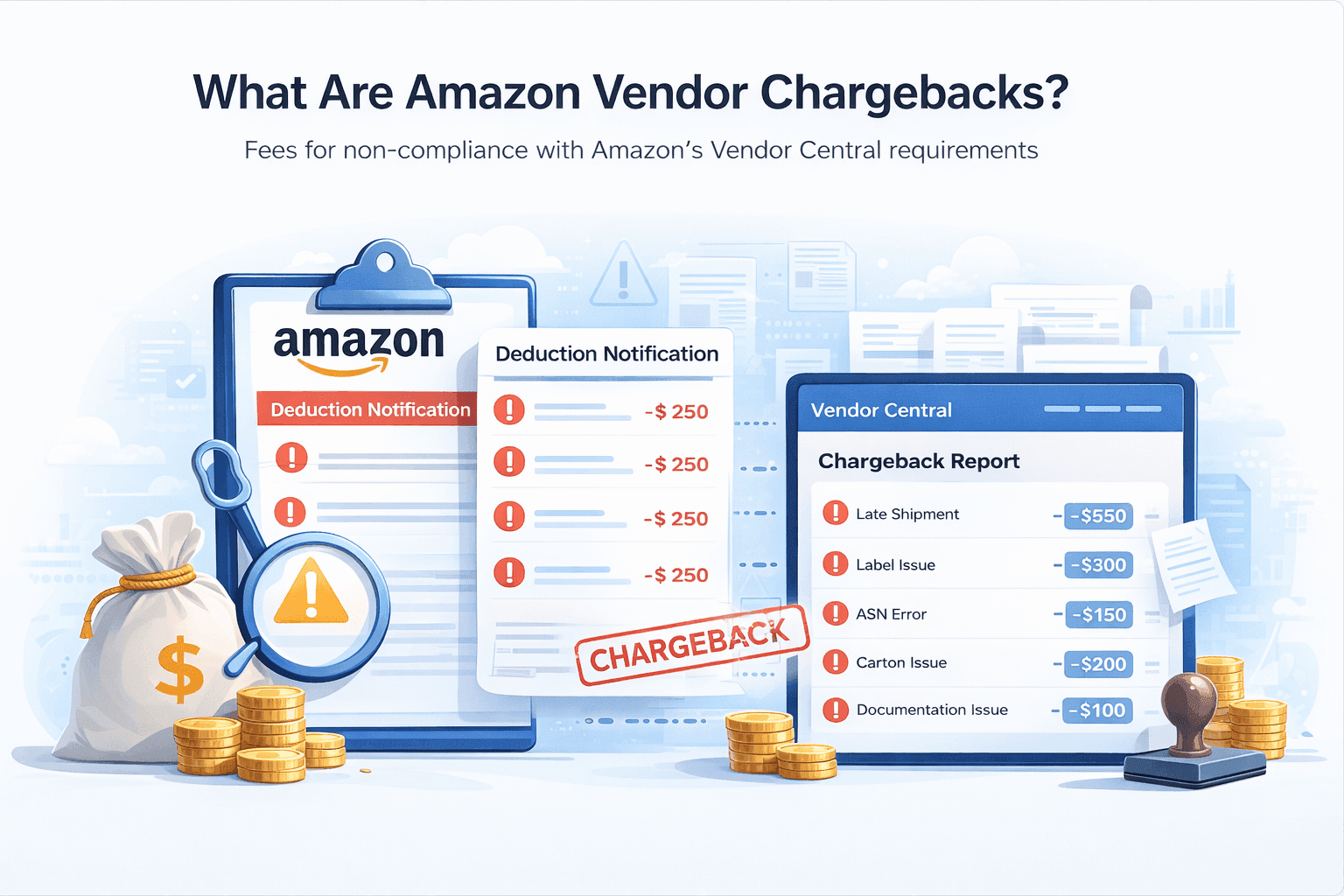 Amazon vendor chargebacks are fees Amazon deducts from a vendor’s invoice when a shipment does not meet Vendor Central compliance requirements. These chargebacks are typically applied for operational issues such as labeling errors, packaging mismatches, late shipments, or incomplete documentation.