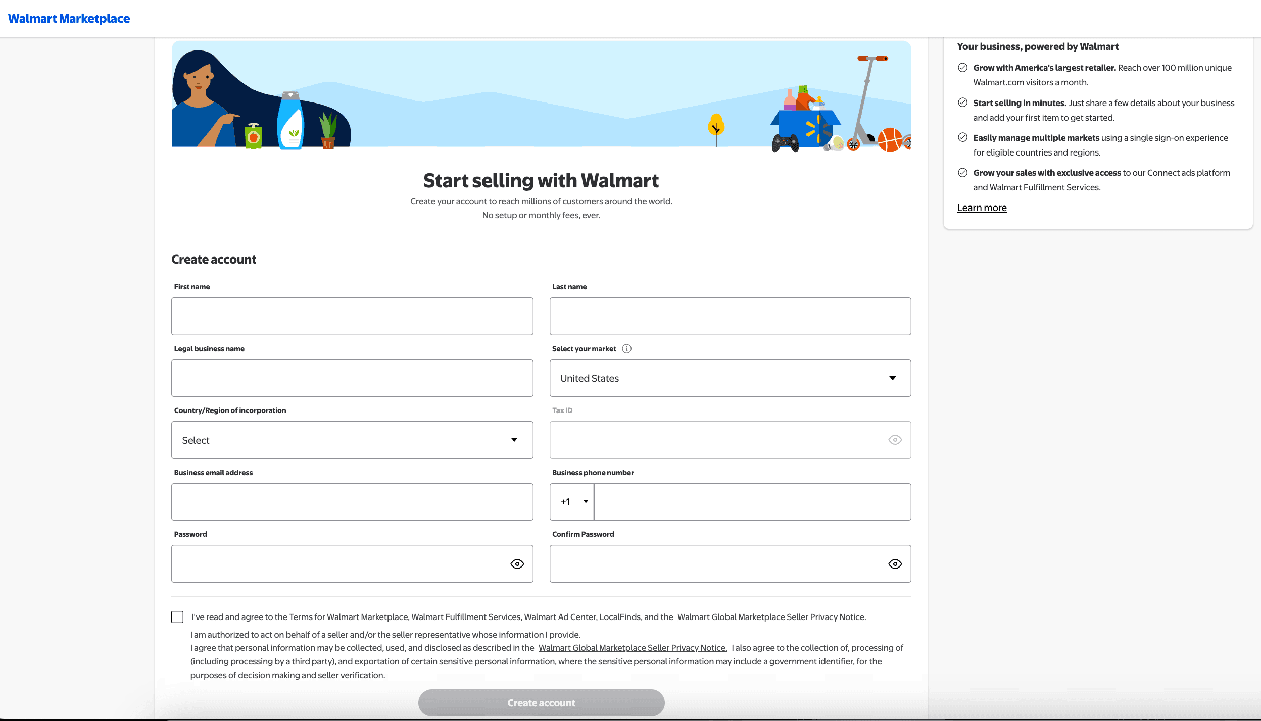 Share what categories you plan to sell in, pricing ranges, and whether you’ll ship orders yourself or use Walmart Fulfillment Services (WFS).Review compliance and restricted product rules