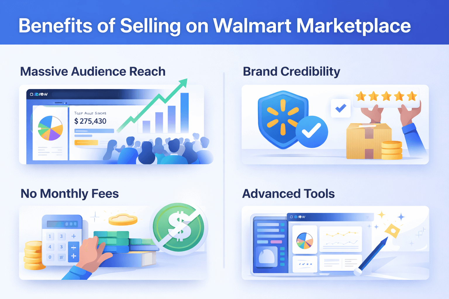 Selling on Walmart Marketplace offers numerous advantages that can significantly boost your business. Here are the key benefits: